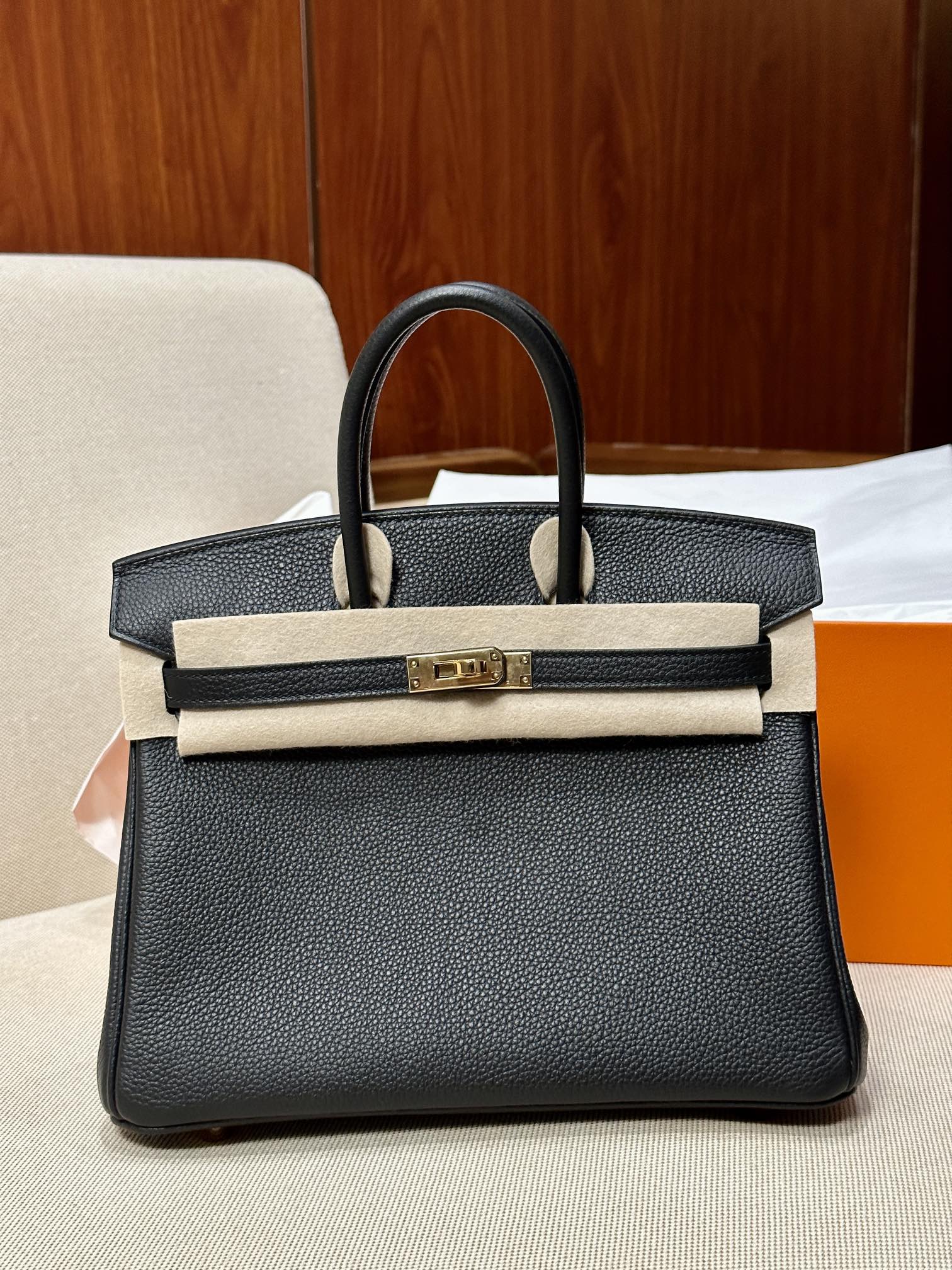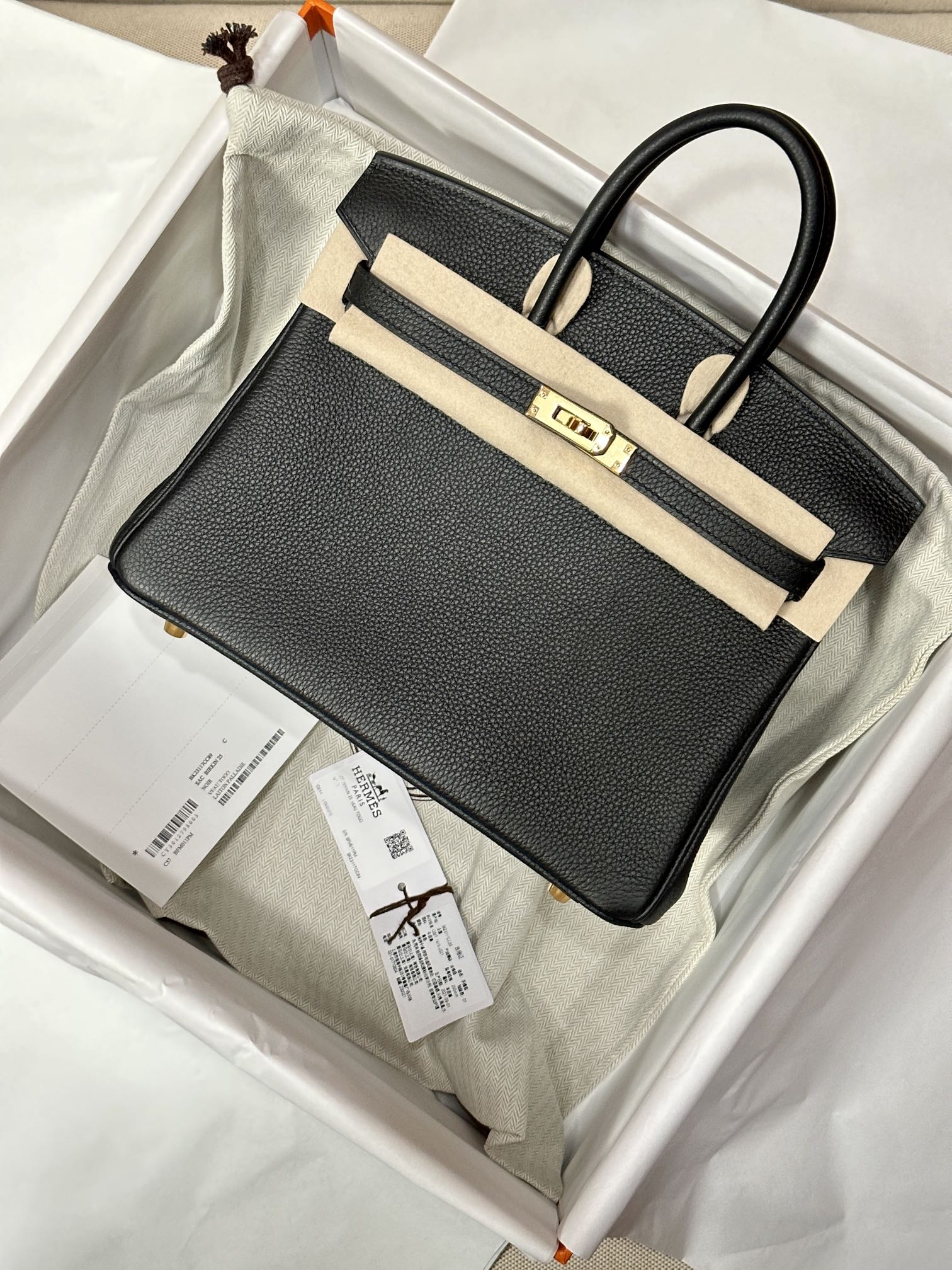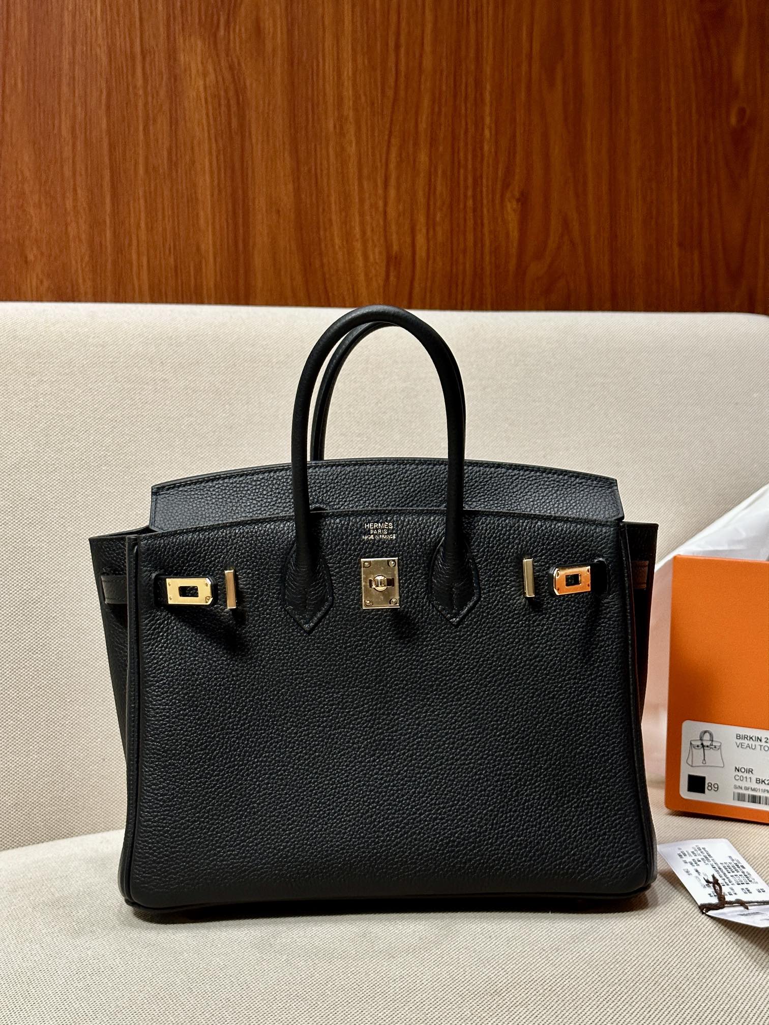 The Hermes Birkin 25 Black Togo GHW is a highly sought-after luxury bag crafted from Togo leather. Togo leather is a popular and durable textured calfskin known for its fine grain and soft feel, and is a commonly used material by Hermès for its classic bags. This handbag typically features gold or palladium hardware and is meticulously handcrafted, making it a must-have for collectors.