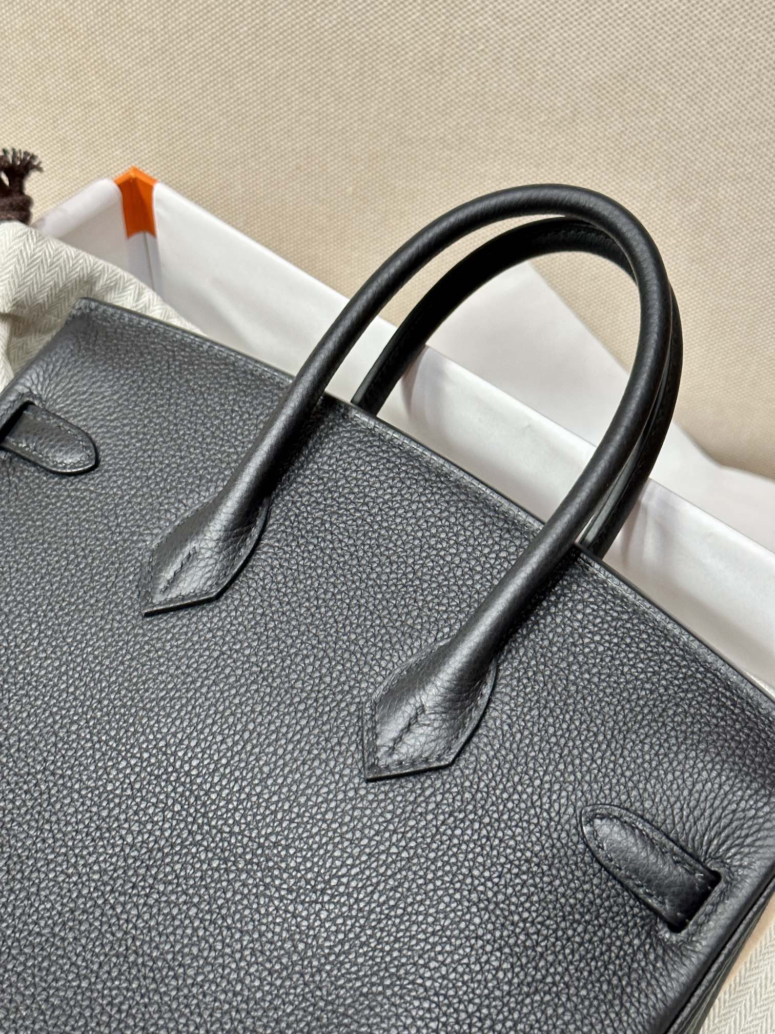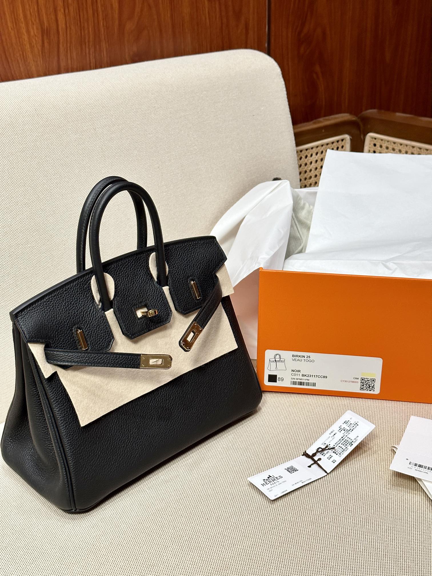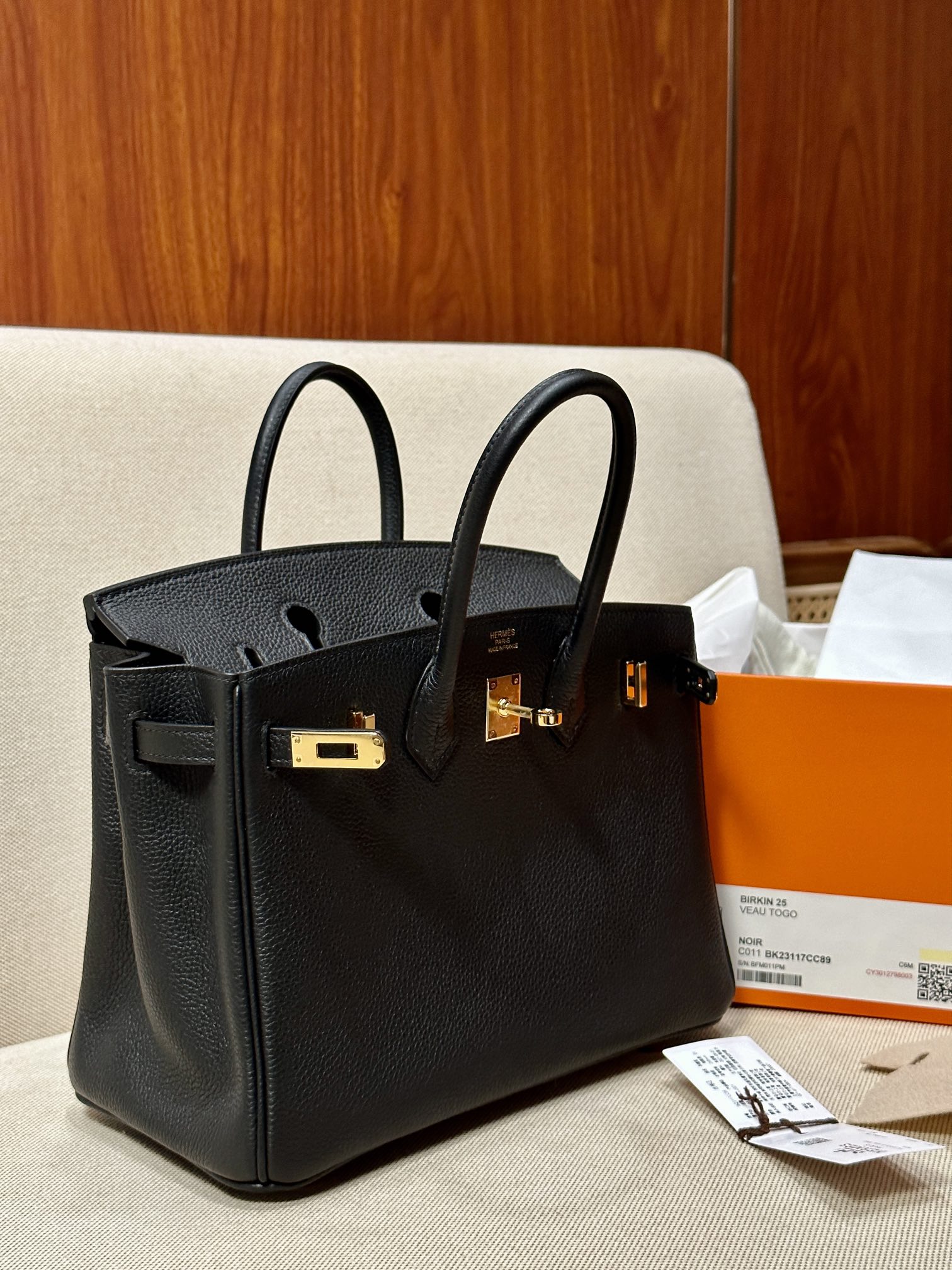 The Hermes Birkin 25 Black Togo GHW is a highly sought-after luxury bag crafted from Togo leather. Togo leather is a popular and durable textured calfskin known for its fine grain and soft feel, and is a commonly used material by Hermès for its classic bags. This handbag typically features gold or palladium hardware and is meticulously handcrafted, making it a must-have for collectors.